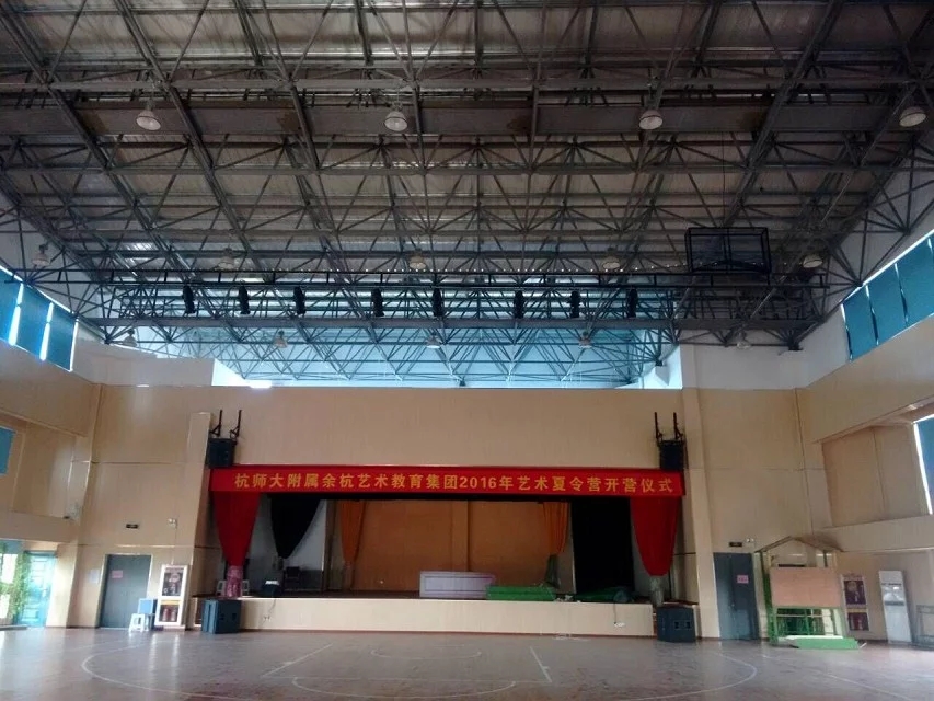 多功能具備大型會(huì)議召開、舞臺(tái)表演等功能,包括專業(yè)擴(kuò)聲系統(tǒng)、數(shù)字會(huì)議系統(tǒng)、舞臺(tái)燈光系統(tǒng)。擴(kuò)聲系統(tǒng)采用2組主揚(yáng)聲器,每組4只雙6.5寸線性陣列揚(yáng)聲器,使主音箱直達(dá)聲可至全場。線陣揚(yáng)聲器具有聲線平直、語言清晰度高、功率大等特點(diǎn),常用于大型場所、音樂廳和娛樂場所??紤]到線陣揚(yáng)聲器高空吊掛,以及會(huì)場聲壓級大小和聲場均勻,配置2只拉聲像揚(yáng)聲器布置在舞臺(tái)前方,4只輔助揚(yáng)聲器壁掛在會(huì)場兩側(cè),配置2臺(tái)返聽揚(yáng)聲器,滿足舞臺(tái)部分?jǐn)U聲需求,為保證舞臺(tái)表演擴(kuò)聲效果,配置兩臺(tái)18寸超重低音揚(yáng)聲器。為保證報(bào)告廳有較高的語言清晰度,各個(gè)位置無回聲、顫動(dòng)回聲和聲聚焦等音質(zhì)缺陷以及舞臺(tái)表演效果,為本系統(tǒng)配置了1臺(tái)數(shù)字音頻處理器和1臺(tái)效果器。數(shù)字會(huì)議系統(tǒng)包括會(huì)議主機(jī)、主席單元和代表單元,各單元采用八芯會(huì)議專用線手拉手連接,擺脫傳統(tǒng)每只話筒單獨(dú)走線的繁瑣,滿足會(huì)議發(fā)言、會(huì)議討論等需求。舞臺(tái)燈光系統(tǒng)主要滿足舞臺(tái)表演需求,采用數(shù)只光束燈、LED帕燈、天排燈、成像燈和三基色等燈光,運(yùn)用舞臺(tái)燈光設(shè)備和技術(shù)手段,隨著劇情的發(fā)展,以光色及其變化顯示環(huán)境、渲染氣氛、突出中心人物,創(chuàng)造舞臺(tái)空間感、時(shí)間感,塑造舞臺(tái)演出的外部形象,并提供必要的燈光效果。