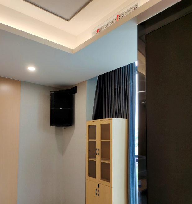 經(jīng)過(guò)現(xiàn)場(chǎng)測(cè)量,現(xiàn)場(chǎng)工程師對(duì)補(bǔ)聲揚(yáng)聲器做了合理的延時(shí)處理,做到聲音從一致方向傳來(lái),極大地降低了相位失真。讓該音頻系統(tǒng)動(dòng)力穩(wěn)定充沛,擴(kuò)聲純凈無(wú)干擾,無(wú)論會(huì)議還是影視觀賞及活動(dòng)演出,都能得到音質(zhì)清晰自然,音頻飽滿的擴(kuò)聲。