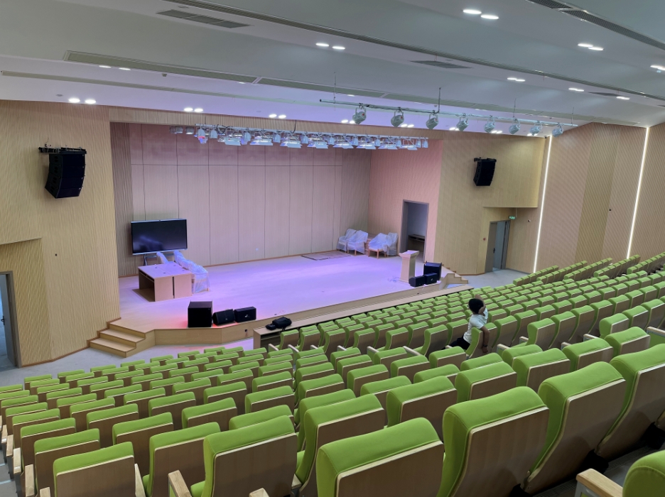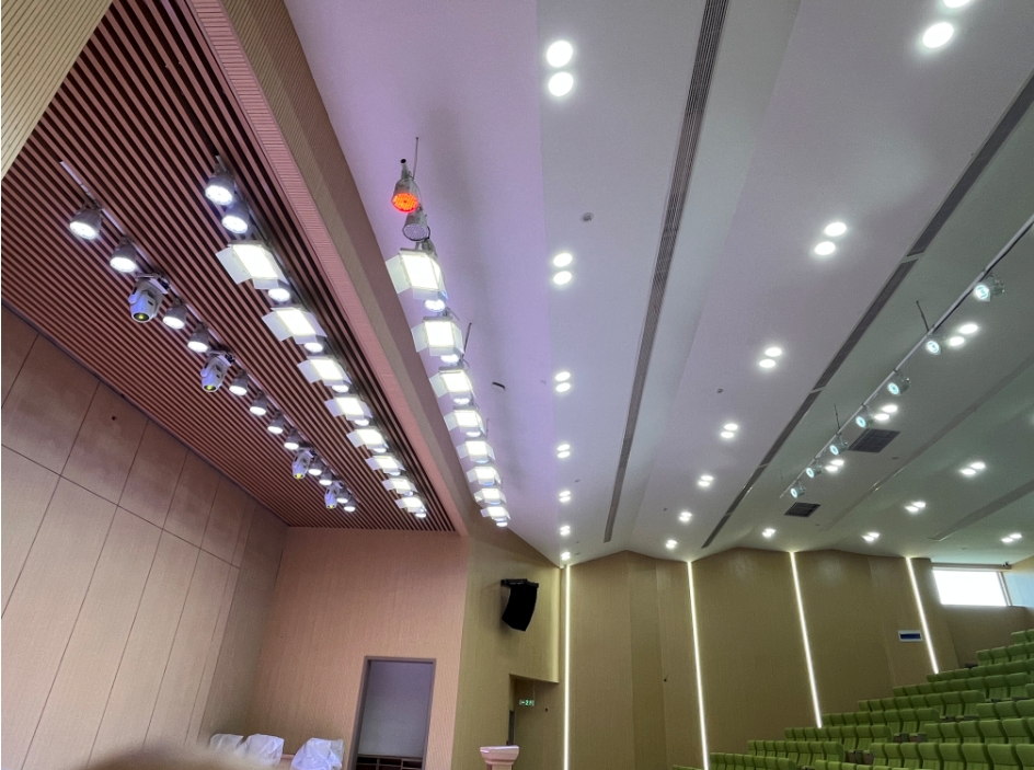 因多功能廳整體建筑面積較大,同時(shí)為階梯式設(shè)計(jì),顧在擴(kuò)聲方面我司采用兩組線陣,通過調(diào)整線陣角度使聲場均勻分布,同時(shí)設(shè)計(jì)了臺唇和返聽使各個位置聲音清晰均勻。