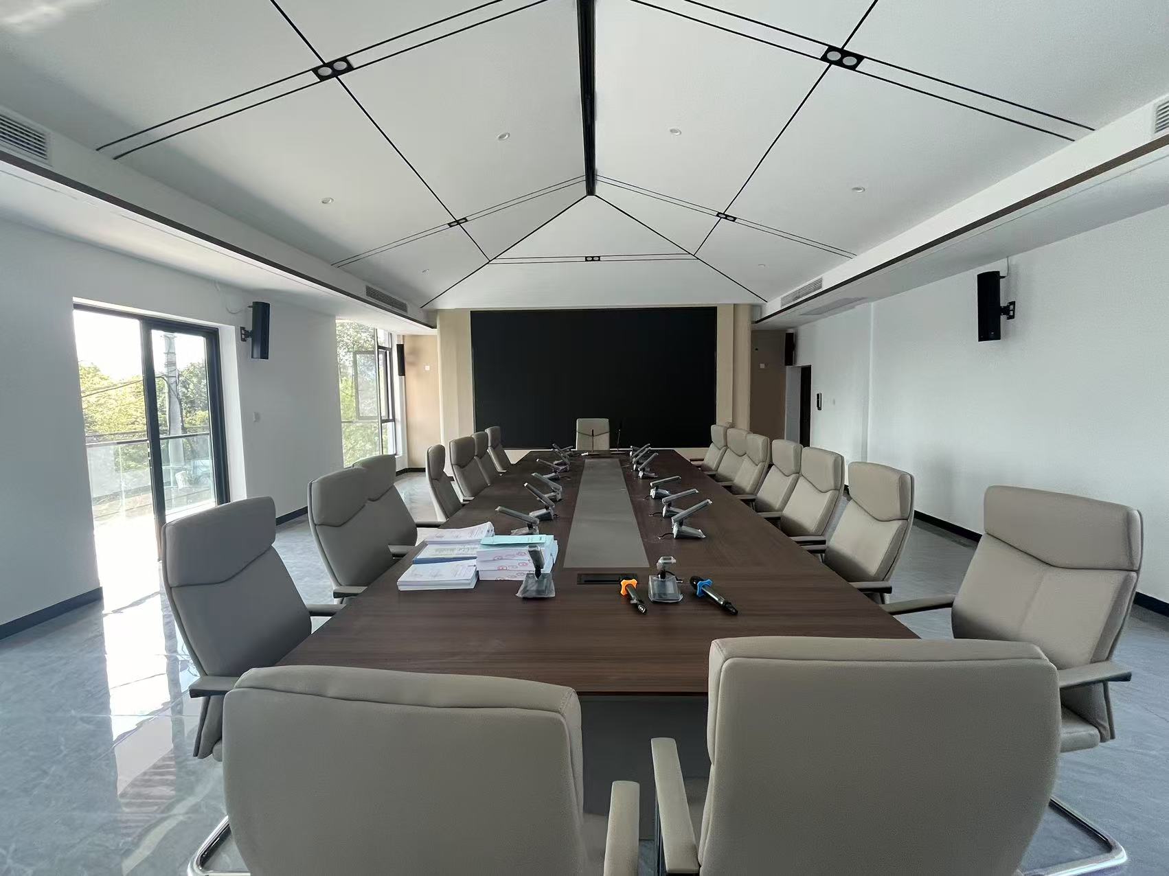 其中,數(shù)字會議系統(tǒng)采用手拉手模式,便于安裝和維護,解決傳統(tǒng)會議室話筒單元發(fā)言容易引起嘯叫、拾音距離短的問題,既美觀又實用。