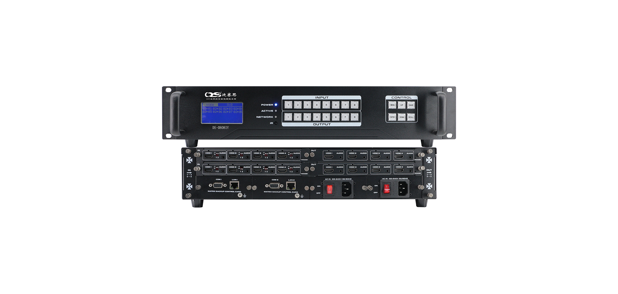 1.8x8混插矩陣主機,全模塊化設計,輸入輸出的音視頻信號、控制信號、電源和風扇全都采用模塊化插拔設計,采用雙電源冗余備份;