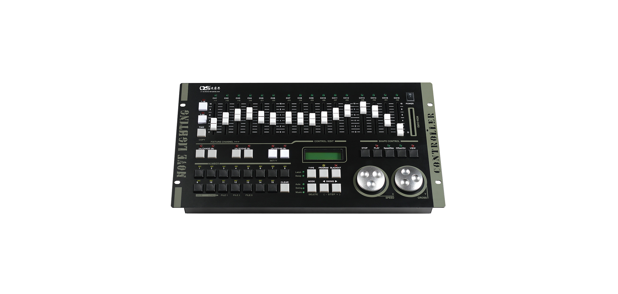 2.最大控制12臺電腦燈或12路調(diào)光,每臺電腦燈可用控制通道16個;